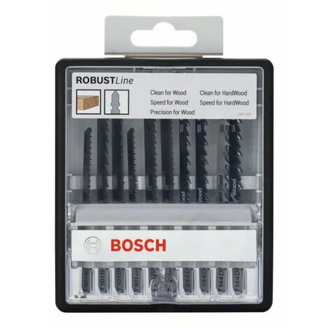 Das 10-tlg. Wood Expert Stichsägeblatt-Set, Robust Line, ist die gängige Wahl für spezielle Holzarbeiten. Die Blätter sind ideal für gerade und Kurvenschnitte. Sie schneiden präzise, schnell und sauber in Hartholz und Holzwerkstoffe. Sie sind kompatibel mit Stichsägen mit einem Einnockenschaftsystem.