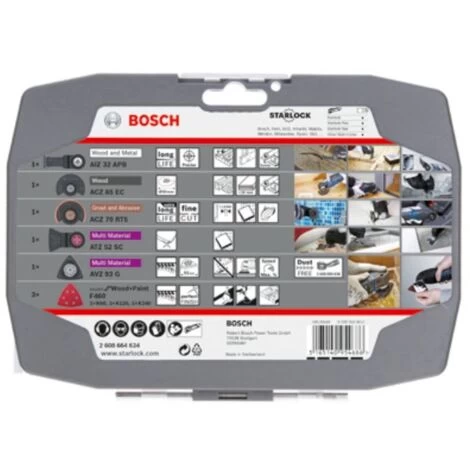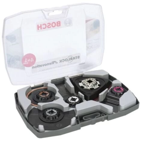 Das 5-teilige Starlock Best for Renovation 4+1 Set enthält eine Auswahl von Sägeblättern für Renovierungsarbeiten mit Holz und Kunststoff. Das Set enthält Blätter für tiefe und schnelle Schnitte, auch Tauchschnitte, und eignet sich zum Sägen von Weichholz, Massivholz, Spanplatten, Profilen aus Kunststoff, zum Entfernen von Mörtel, Fliesenkleber, harten Teppichkleberresten, zum Ausfräsen von Fugen und zum Abschleifen von Farbe und Lack. Alle Blätter sind für Starlock Max-Multifunktionswerkzeuge geeignet. Das System Starlock Max ermöglicht selbst bei härtestem Einsatz eine maximale Schnitttiefe, Geschwindigkeit und Vielseitigkeit. Außerdem ermöglicht das Starlock-Aufnahmesystem einen schnellen Blattwechsel in nur drei Sekunden ohne Berührung des Sägeblatts, und durch seine dreidimensionale enge Passung eine maximale Kraftübertragung zwischen Maschine und Zubehör.