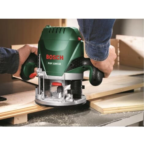 Oberfräse POF 1200 AE. Kraftvoll und präzise für kreatives Arbeiten mit Holz. Materialgerechte Vorwahl der Drehzahl durch Bosch-Electronic mit Stellrad und Gasgebeschalter. Einfacher und schneller Fräserwechsel durch integrierte Spindelarretierung. Bosch-SDS-System: Ermöglicht ein einfaches. werkzeugloses Einsetzen der Kopierhülse. Starker 1.200-Watt-Motor für anspruchsvolle Aufgaben in allen Holzarten. Anschluss zur Staubabsaugung – für staubfreies Arbeiten. Transparente Spanschutzhaube schützt vor umherfliegenden Spänen. Herausragendes ergonomisches Design mit Softgrip für komfortables und sicheres Arbeiten. Absaugadapter (2 600 499 077). Gabelschlüssel (1 609 203 V40). Kopierhülse (2 609 200 138). Nutfräser (Durchmesser 8 mm) (2 608 628 381). Parallelanschlag (1 609 203 M85). Spannzangen (3 Stück). Zentrierstift (2 609 200 310)