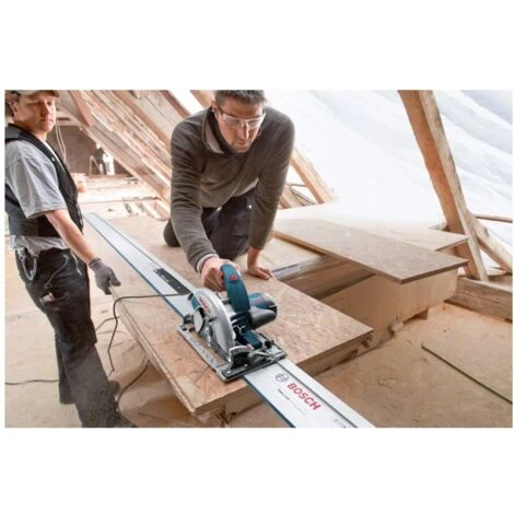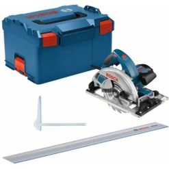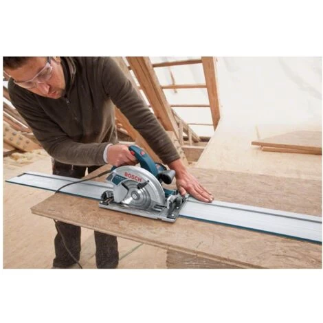 Handkreissäge GKS 65 GCE + FSN 1400Die Kreissäge GKS 65 GCE Professional ist die ideale Wahl für geführte Schnitte in einer Vielzahl von Materialien. Die starke und präzise Kreissäge ist mit einem 1.800-W-Motor ausgestattet und erreicht eine Schnitttiefe von 65 mm. Für genaue Schnitte wurde sie für die Anwendung mit dem Bosch Führungsschienensystem optimiert. Dank der Drehzahlvorwahl liefert sie einen gleichmäßigen Sägefortschritt in verschiedensten Materialien. Die Kreissäge wurde speziell für schwierige Anwendungen konstruiert und sägt verschiedene Materialien, z. B. Holzwerkstoffe wie OSB, Sperrholz oder MDF. Sie ist mit dem Bosch Führungsschienensystem kompatibel, ebenso mit den Führungsschienensystemen von Mafell, Festool und Makita. Die GKS 65 GCE Professional ist mit Gebläse, Absaugstutzen, Fußplatte aus Aluminiumdruckguss, konstanter Drehzahl, Sanftanlauf und Spindelarretierung ausgestattet. Lieferumfang:1 x Kreissägeblatt, Speedline Wood, 190 x 30 x 2,6 mm, 12 (2 608 640 800)L-BOXX 238 (1 600 A01 2G2)1 x Führungsschiene FSN 1400 (1 600 A02 1AV) | Eigenschaften: Gewicht: 5,2 kg, Leistungsaufnahme: 1800 W, Leerlaufdrehzahl: 2300-5000, Sägeblattbohrung: 30, Sägeblattdurchmesser: 190 mm, Grundpreis: Nein, Max. Leerlaufdrehzahl: 5000, Min. Leerlaufdrehzahl: 2300