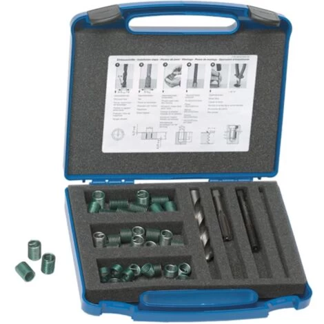 Gewindereparatur-Sätze metrisch für die Instandsetzung oder Gewindepanzerung • Anwendung: Zur Gewindepanzerung in Werkstoffen mit geringer Scherfestigkeit. zur Instandsetzung beschädigter und abgenutzter Gewinde und zur Ausschussrückgewinnung. • Ausführung: Reparatursatz für die jeweilige Gewindegröße 20 x M4/M5/M6 oder 10 x M8/M10/M12. jeweils in 1 x D/1.5 x D/2.0 x D sowie HSS Spiralbohrer. HSS Gewindebohrer. Eindrehwerkzeug und Zapfenbrecher aus hochfestem Stahl • Vorteil: korrosions- und wärmebeständig. verschleißfrei. Ausschussrückgewinnung. gleichmäßige Last- und Spannungsverteilungbreites Sortiment deckt ein breites Bearbeitungsspektrum abhochwertiger und langlebiger Einsatz mit anwenderfreundlichem Handling